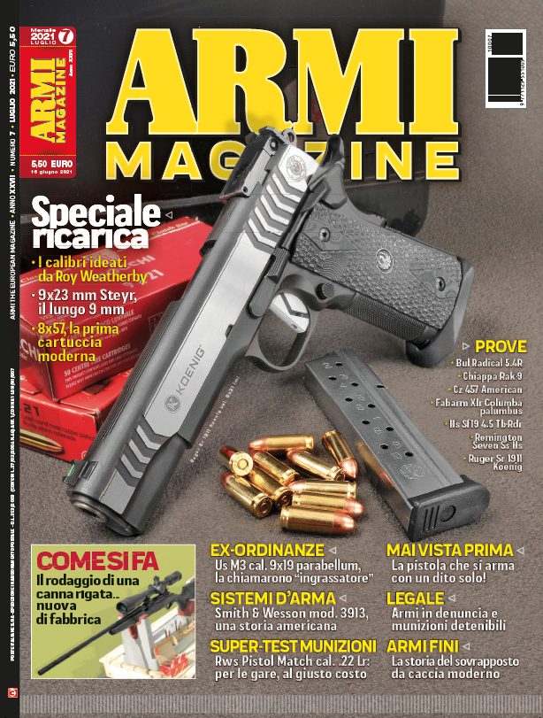 Tra le altre prove a fuoco più interessanti di Armi Magazine luglio 2021, possiamo segnalare: Bul Radical 5.4R cal. 9×21 Imi, Fabarm Xlr Columba palumbus cal. 12, Hs Sf19 4.5 Tb-Rdr cal. 9×21 Imi, Cz 457 American cal. 22 Wmr, Remington Seven Ss Hs cal. .308 Winchester e Chiappa Rak9 cal. 9×21 Imi. Tre argomenti “legali” in primo piano: l’annosa questione (italiana) del calibro 9×19; il collegamento tra le specifiche armi che si hanno in denuncia e le munizioni detenibili; i certificati medici per chi chiede una licenza di porto d’armi. Il super – test sulle munizioni è dedicato alle Rws Pistol Match cal. .22 Lr, che si distinguono per la docilità di sparo e il buon equilibrio qualità/prezzo. Lo speciale del mese è rivolto alla ricarica: si parte dal 9×23 mm Steyr per passare alla prima cartuccia moderna, l’8×57, e si conclude con i cinque calibri più importanti ideati da Roy Weatherby. Per le ex-ordinanze, ecco la M3 “Grease Gun”: prodotta durante la Seconda guerra mondiale in ossequio ai criteri del basso costo e della massima funzionalità, è stata al fianco delle Forze armate americane anche nei successivi teatri bellici. Per l’approfondimento sui sistemi d’arma, è la volta della Smith & Wesson 3913: ripercorriamo insieme l’avvincente (e intrigante) storia di come e perché si arrivò a progettarla. Nel dossier di questo numero, sperimentiamo – passo dopo passo – il rodaggio di una canna rigata nuova di fabbrica. E ancora, su Armi Magazine luglio 2021, la rubrica ‘Questione di legge’, la storia del sovrapposto da caccia moderno, quattro accessori per rendere più performanti le Glock, una pistola davvero unica (si arma con un dito!), e tanto altro ancora. Buona lettura dallo staff di Armi Magazine.