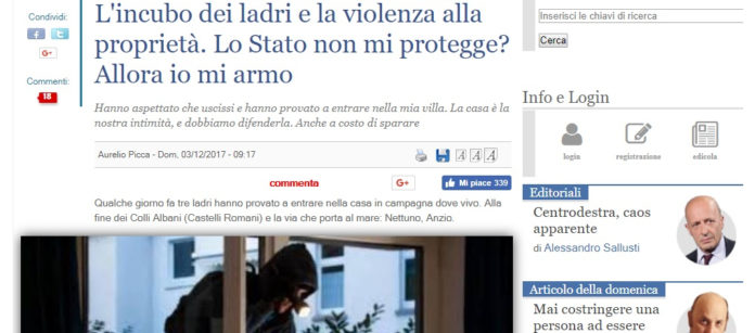 “L’incubo dei ladri e la violenza alla proprietà. Lo Stato non mi protegge? Allora io mi armo”. Il Giornale titola così l’articolo dello scrittore Aurelio Picca pubblicato sull’edizione di ieri del quotidiano. Picca racconta del tentativo di furto consumato qualche giorno fa nella sua casa di campagna sui Colli Albani e si dice certo che, “se i ladri avessero varcato la finestra e messo piede qui dentro, e io avessi avuto in pugno o imbracciato pistola o fucile, avrei sparato”. Nelle parole dello scrittore, più che il furto in sé pesa la violazione dell’intimità (“uno stupro che squarcia il velo del nostro pudore e permette a degli sconosciuti di camminare con gli scarponi chiodati dentro l’interiorità”).