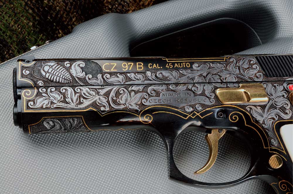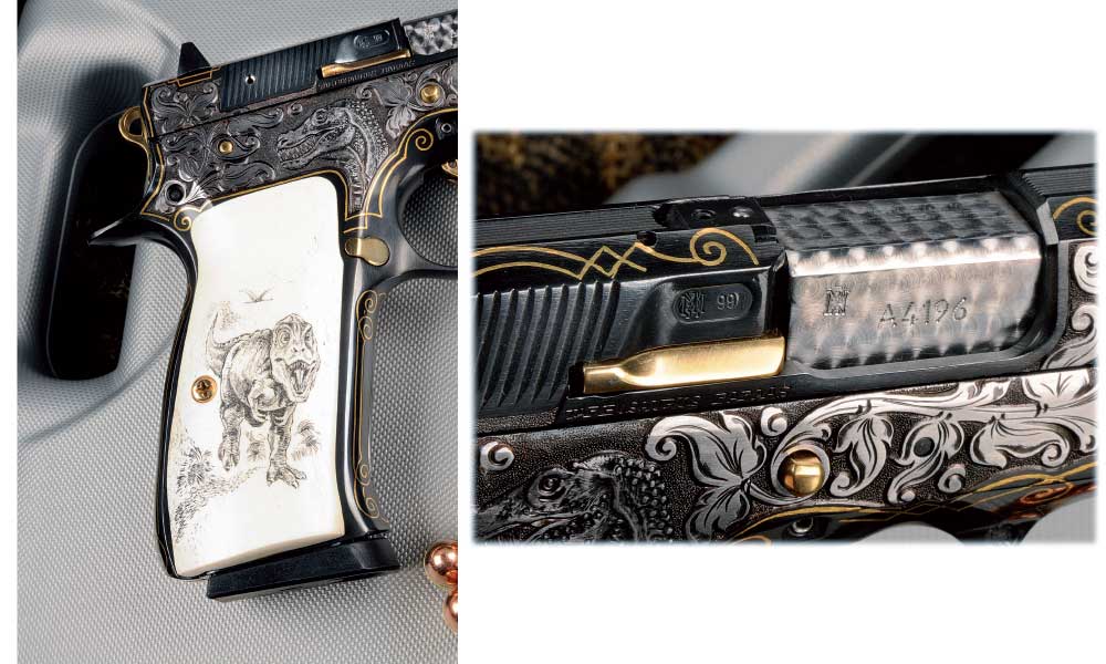 Grilletto, hold-open e pulsante di sgancio del caricatore sono rivestiti in oro; sopra il nome del modello è inciso in oro. Notare la pregiata lavorazione floreale