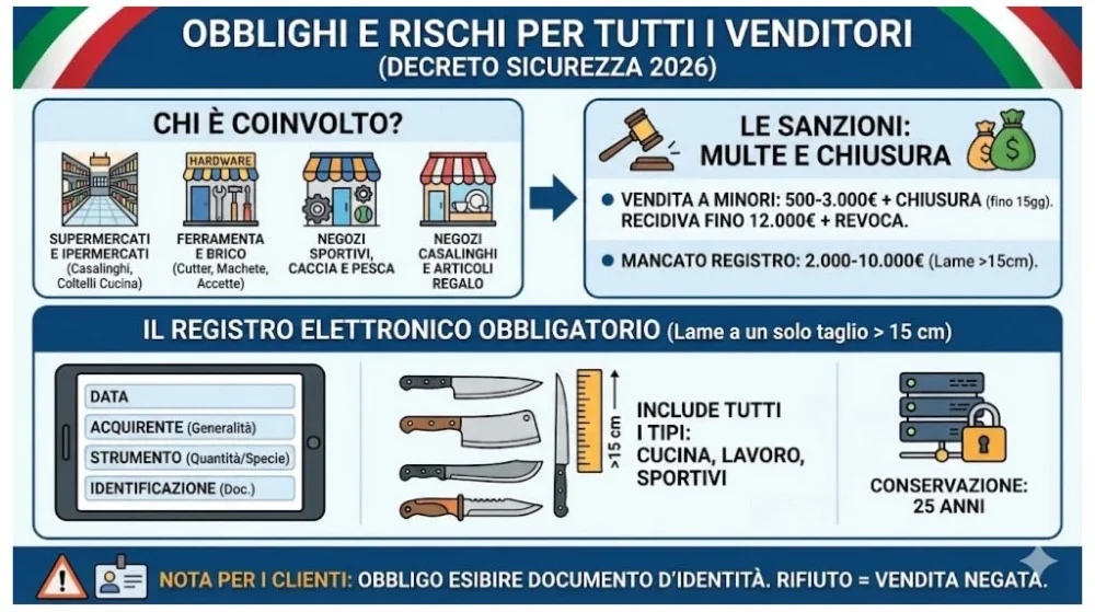 Il Decreto Sicurezza 2026 introduce importanti obblighi e restrizioni sulla vendita, il trasporto e il possesso di coltelli.