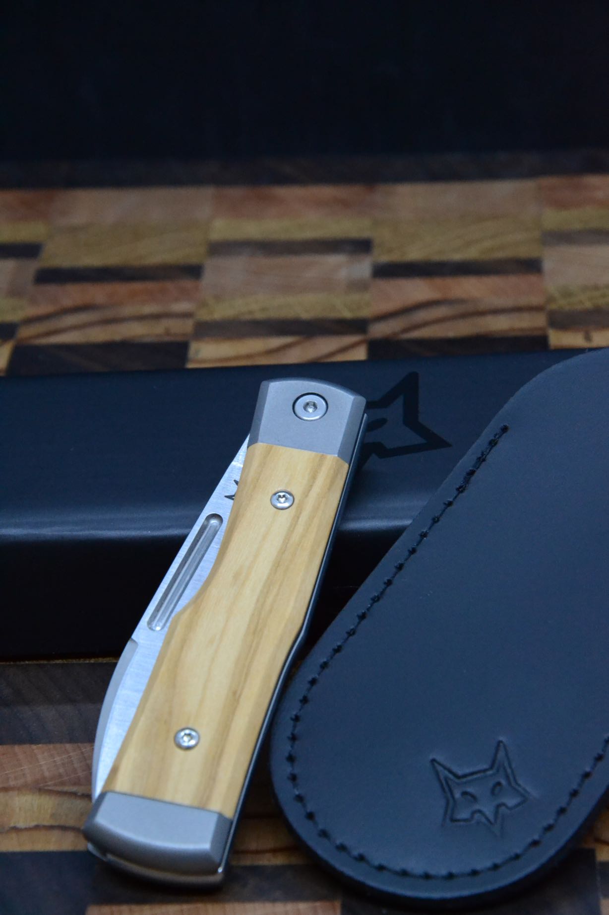 Il manico del Fox Barlow è realizzato in titanio e legno di ulivo. Le venature del legno si contrappongono elegantemente al titanio, dando risalto al manico, mentre i dettagli lucidi della viteria in acciaio Aisi 303 regalano un tocco luce in più all’insieme.