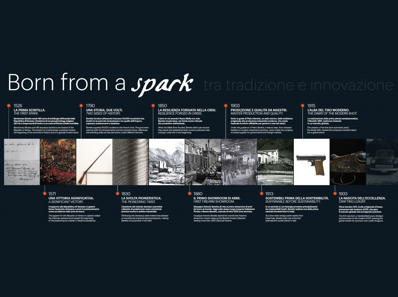 “Da quel momento in poi, c’è sempre stato un membro della nostra famiglia a guidare l’azienda. Oggi siamo alla quindicesima generazione e siamo ancora qui, a Gardone Val Trompia, fedeli alla nostra eredità, orgogliosamente italiani e fortemente legati alla Valle e alla sua gente, ma con lo sguardo rivolto al mondo… e al futuro. Sono passati cinque secoli, ma quel fuoco, quella passione che ci animava allora, brucia ancora oggi, non solo nella nostra famiglia, ma in tutte le persone che hanno lavorato per rendere questa azienda un marchio di fama mondiale e un’azienda manifatturiera all’avanguardia” hanno dichiarato i rappresentanti della 15esima generazione della famiglia Beretta: Pietro Gussalli Beretta, presidente e ceo di Beretta Holding, e Franco Gussalli Beretta, presidente e ceo di Fabbrica d’Armi Pietro Beretta Spa.