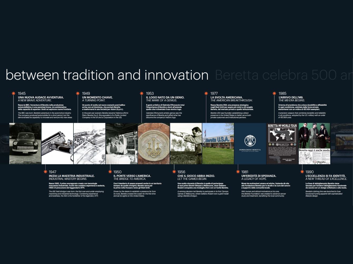 È un traguardo irripetibile per la più antica fabbrica d’armi al mondo: “Lo celebreremo per tutto l’anno, con l’obiettivo di coinvolgere il maggior numero di persone, cercando di far sentire tutti parte di questo anniversario. Non si tratta solo di una celebrazione della nostra famiglia e della nostra gente, ma di un tributo a ogni singolo cacciatore, tiratore o appassionato che ha reso Beretta ciò che è oggi, e un omaggio a coloro che renderanno Beretta ciò che sarà domani” ha affermato Carlo Gussalli Beretta, rappresentante della 16esima generazione.