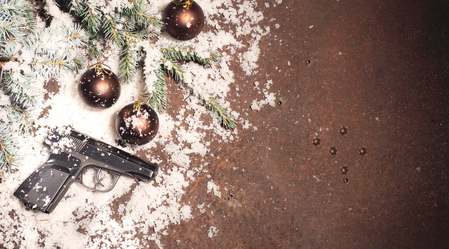 Pistol,And,Christmas,Balls,On,Rustic,Metal,Background.