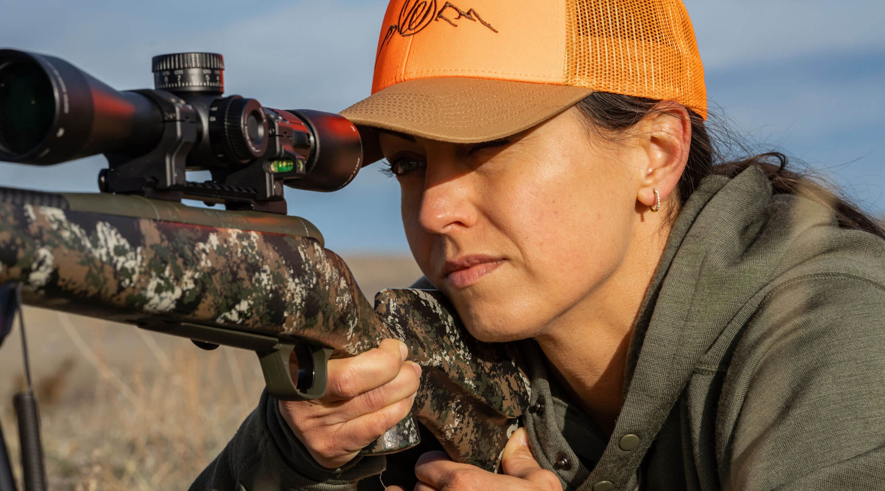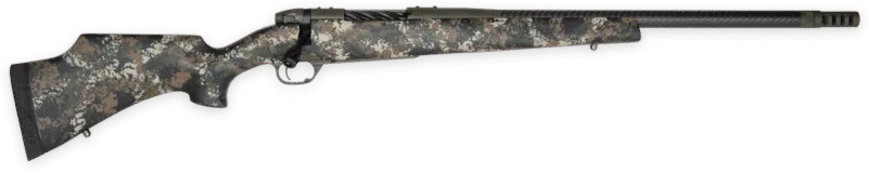 La denominazione è limpida: l’azione è la classica Mark V, con otturatore fluted spiralizzato a sei tenoni (apertura a 54°, finitura Cerakote nero grafite anche per la manetta); in otto dei nove calibri disponibili (.240 Weatherby magnum, .243 Winchester, .280 Ackley Improved, 6,5 Creedmoor, 6,5 Weatherby Rpm, .22 Creedmoor, .25 Creedmoor e .25 Weatherby Rpm: 4+1 colpi per i primi cinque, uno in meno per gli ultimi tre) la canna Bsf, in fibra di carbonio, misura 559 millimetri, ai quali aggiungere i 51 del freno di bocca Accubrake Dst: fa eccezione il .308 Winchester, nel quale si scende a 508.