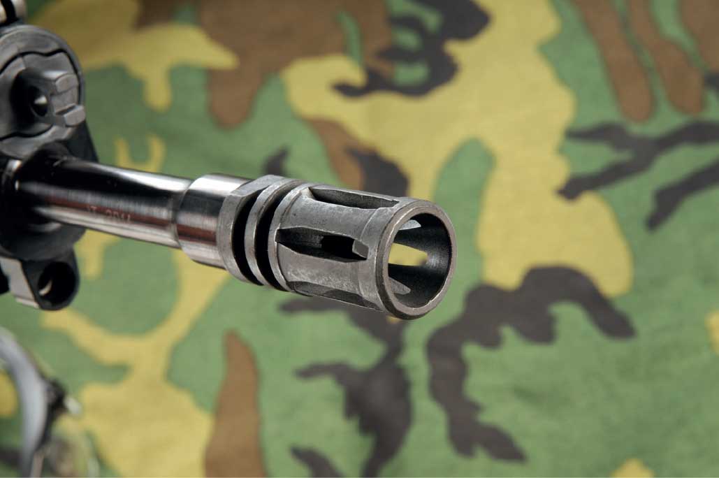 La canna montata è da 16,6” con un passo di rigatura di 1:16”; termina con un rompifiamma che ha valenza puramente estetica, data la tranquillità della munizione in questione. L’arma è dotata di 4 slitte Picatinny, sempre realizzate in polimero, che permettono l’adozione di una gamma vastissima di accessori, per quanto riguarda le mire ma non solo. Gli organi di mira forniti a corredo comprendono una tacca Williams regolabile in alzo e deriva, montata sulla slitta Picatinny superiore (facilmente smontabile per essere sostituita da un cannocchiale o un punto rosso), e un mirino a palo protetto da un tunnel in polimeri.