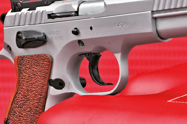Alloggiato nel fusto, troviamo il gruppo di scatto a singola e doppia azione, estraibile e caratterizzato dall’avere la molla cinetica, non più a tutta lunghezza e parallela al caricatore come un tempo ma, ormai da diversi anni, simile a quella resa celebre dalle Tokarev, che l’aveva posizionata all’interno del cane. Sulle Tanfoglio, la corta molla è posta in gran parte all’esterno del cane, ed è messa in posizione obliqua contro la parete posteriore del vano caricatore. Questa sistemazione ha consentito di migliorare l’incavo dell’elsa e ridurre il trigger reach anche con cartucce “lunghe”, ma ha resa un po’ meno “liscia” la doppia azione. La corsa del grilletto ha carico costante fin verso la metà, successivamente il carico cresce fino a raggiungere il picco massimo oltre il quale si ha lo sgancio del cane, seguito da una breve corsa a vuoto del grilletto. La doppia azione migliora con l’uso e anche il neofita riesce con un po’ di allenamento a percepire distintamente l’istante in cui il cane è prossimo a sganciarsi. Il passaggio dalla doppia alla singola è rapido e facile, complici la forma arcuata del grilletto, la sua alta velocità di ritorno in avanti e la brevità della relativa corsa di riarmo della percussione. Lo scatto in singola dell’esemplare provato è particolarmente pulito e ben prevedibile, con un carico complessivo intorno ai due chiletti scarsi, parte dei quali, circa 500 grammi, a carico della molla del grilletto nel primo tratto di corsa a vuoto. Il ritorno in avanti del grilletto è particolarmente veloce e, vista anche la brevità della corsa per l’impegno dei piani di contrasto, sono possibili intertempi molto contenuti tra un colpo e l’altro. Con le Tanfoglio è difficile impuntarsi anche sparando molto velocemente; con adeguato allenamento la celerità nella ripetizione del colpo può arrivare a valori altissimi, ma è già alta anche quando si sta iniziando a prendere confidenza con la pistola. La sicura manuale, con leve maggiorate una per fianco (ottime per i mancini e per un uso sportivo nel quale sono previsti esercizi con la mano debole), è uno dei tratti caratteristici di questo allestimento della P21 L; la sicura agisce come quella di tutte la altre Tanfoglio: è facoltativa e non svolge funzione di abbatticane, per cui è possibile tenere l’arma cocked and locked, ovvero con colpo in canna, cane armato e sicura inserita, modalità di pronto al fuoco prevista nella divisione Esp. Sulla P21 L è possibile, ovviamente, anche tenere il colpo in canna e avere cane abbassato (come previsto per la divisione Ssp), per sparare il primo colpo in doppia azione. Il problema è quello di abbassare il cane manualmente su una camera piena, tipico di tutte le pistole ad azione mista con sicura selettiva; per la P21 L c’è da dire che, vista la forma della cresta del cane, è davvero difficile ipotizzare che questo possa sfuggire al pollice mentre lo disarmiamo manualmente. La sicura, inseribile sia a cane armato sia disarmato, blocca positivamente il dente di scatto ed il cane, ma non il carrello; questa sarà però bloccato dal cane se la sicura è inserita a cane abbassato, mentre con la pistola cocked and locked si può manovrare il carrello pur avendo l’arma in sicura. Le leve sono ben dimensionate e non danno fastidio al momento dello sparo, sia che il pollice venga tenuto appoggiato o ripiegato al di sotto; anche la manovra di inserimento e disinserimento risulta agevole e ben percepibile.